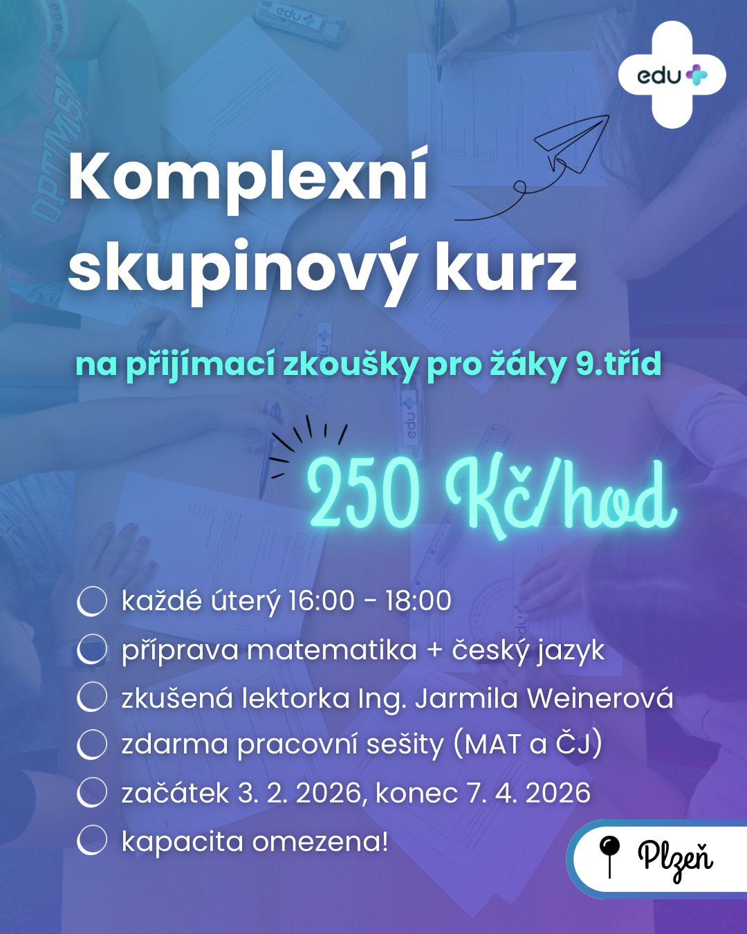 📣 Od února 2026 otevíráme Komplexní skupinový kurz k přípravě na přijímací zkoušky pro žáky 9.tříd – pobočka PLZEŇ.