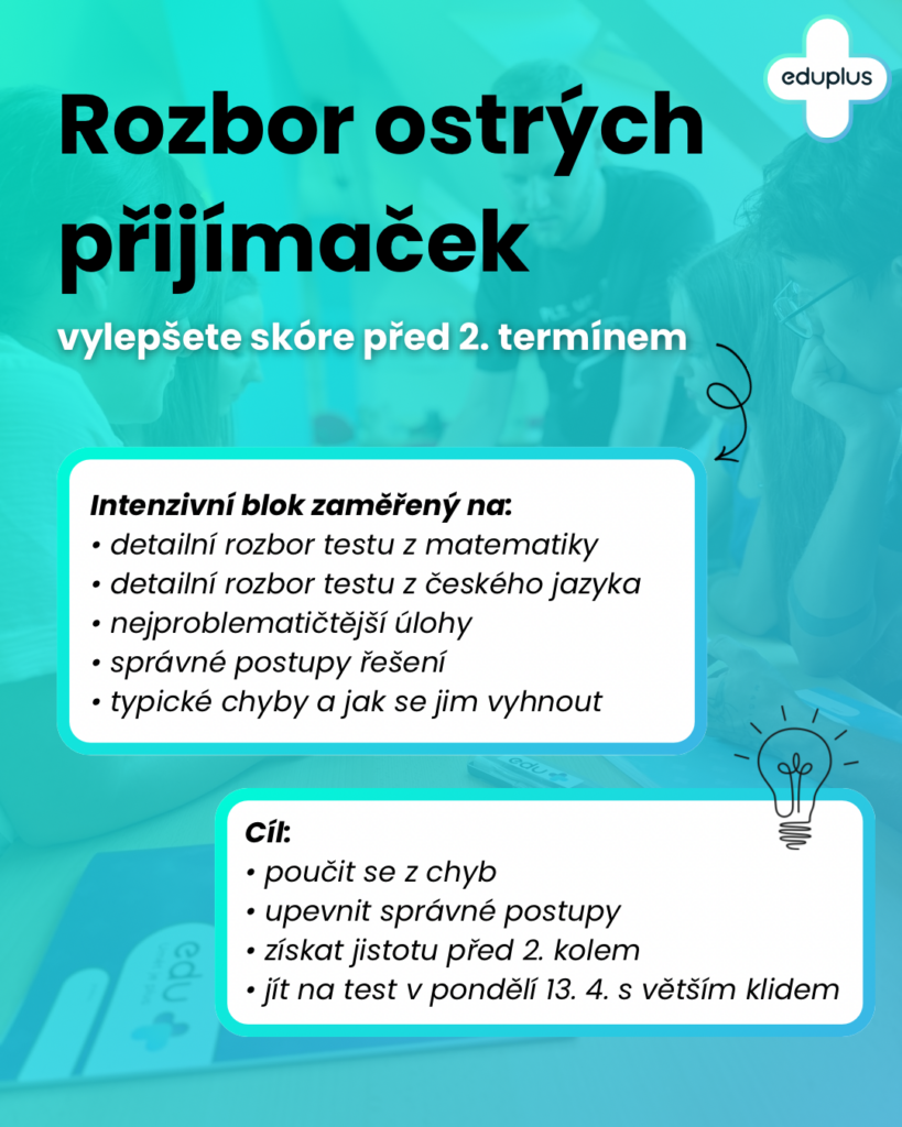 Využijte volnou sobotu mezi prvním a druhým kolem přijímacích zkoušek k maximální přípravě. V sobotu 11.4. pořádáme speciální intenzivní blok zaměřený na detailní rozbor testů z matematiky a českého jazyka, které žáci psali o den dříve (v pátek 10. 4.).